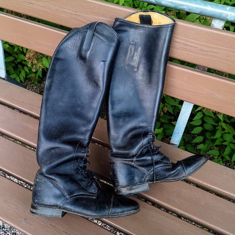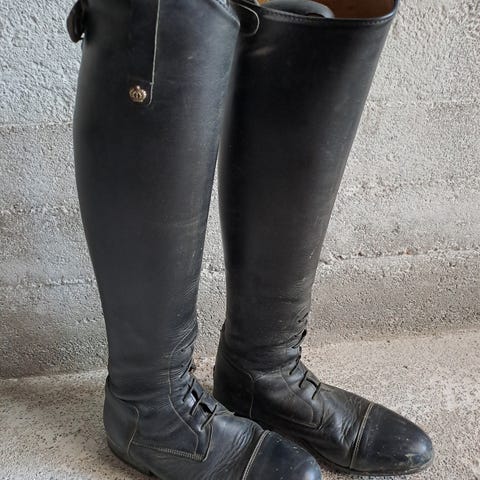 Käyttämättömät naisten ratsastussaappaat. Aikoinaan mittarilaustyönä tehty. Hobu oli niin vanha, ettei enää käyty kisoissa, niin jäi saappaat käyttänäti.