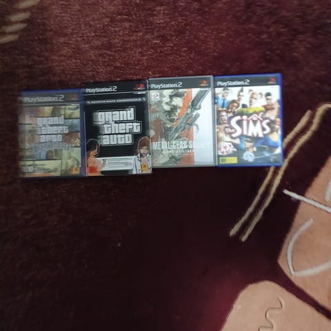 Grand theft auto kaksoispakkaus. Kolmonen ja Vice City. Grand theft auto San Andreas. Metal Gear Solid Sons of liberty. Ja the Sims.