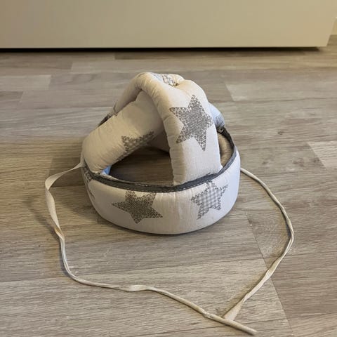 Pehmeä, säädettävä suojakypärä. Toinen nauhoista oli irronnut, mutta korvattu uudella. Siisti, vain vähän käytetty.
