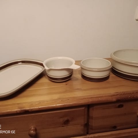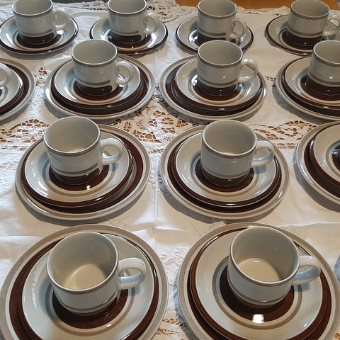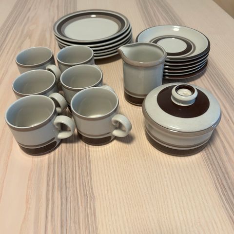 Myydään 8 kpl kahvikuppeja, 8 kpl pieniä lautasia, 7 kpl isompia lautasia.
