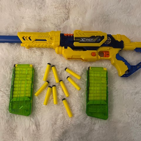 Nerf X-Shot lasten leluase, sininen ja oranssi väri. Sopii lasten leikkeihin ja harjoitteluun. Panoksia ei valitettavasti ole
