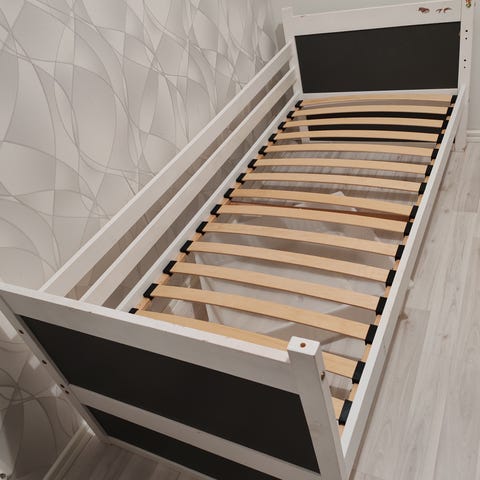 Toisen sängyn pohjan yksi lauta oli edellisellä omistajalla vaihdettu kuvassa näkyvään ruskeaan lautaan. On toiminut meillä jopa teinipojalla, pikkuparvena.