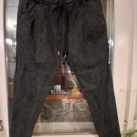 Perfect Jeans by Pias. Harmaat, siistit farkut, koko M. Nappikiinnitys. Mukana elastaania, pesulappu värjääntynyt harmaaksi, niin ei selviä tarkka määrä. Veikkaan alle 5 %, kun katsoin By Piasin verkkosivuilta muita farkkuja.