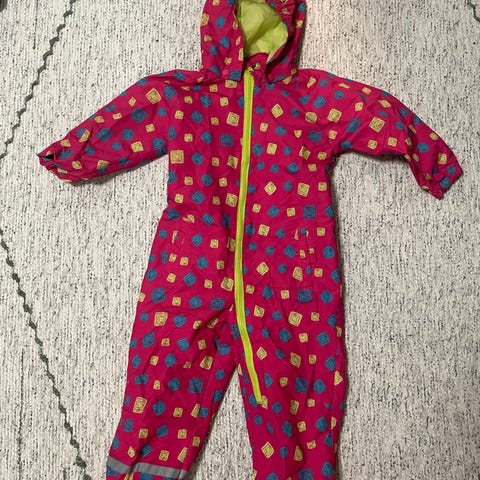 Tahroja on varsinkin haalarin takana, ja jalkalenksut kannattaa uusia piakkoin. Nimikoitu kynällä. Ehjä ja toimiva haalari kevään ja syksyn hiekkalaatikkoleikkeihin tai kesän viileämpiin päiviin.