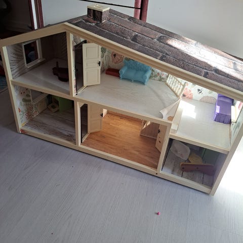 Isompaan nukkekotiin kaksi puutuolia. Maalattu vanhan vihreiksi ja hiottu patinoituneen näköisiksi.