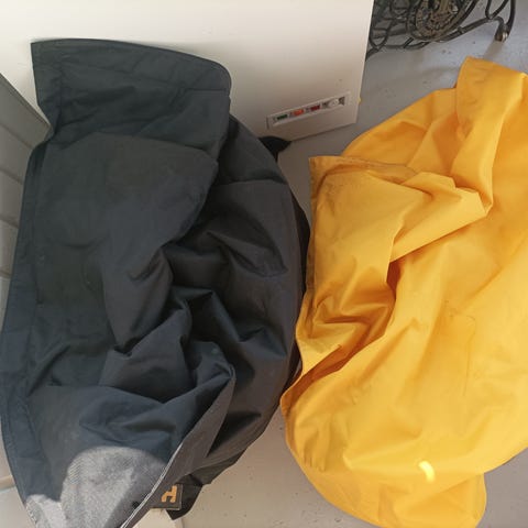 2 säkkituolia, joidenka pinta-materiaali on revennyt molemmista samalla tavoin. Pinta-materiaali on muovitettua, kiiltävää kangasta. Toisessa vielä liimajämät Jesse-teipistä. Toisesta sain jämät pois haavan puhdistusaineella. Korjaustaitoiselle tai tuunaajalle hyvät.