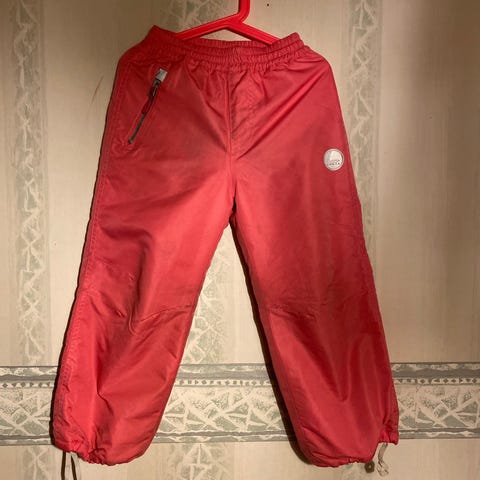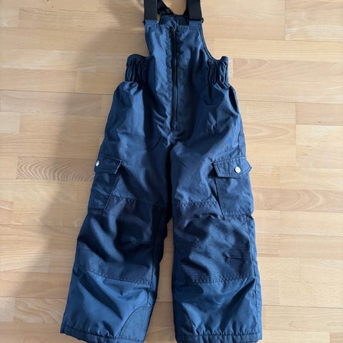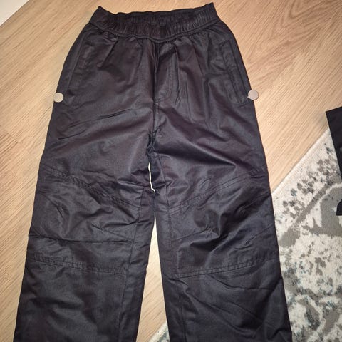 Mustat toppahousut koko 110. Ei pidä vettä. Lahkeissa pientä kulumaa.