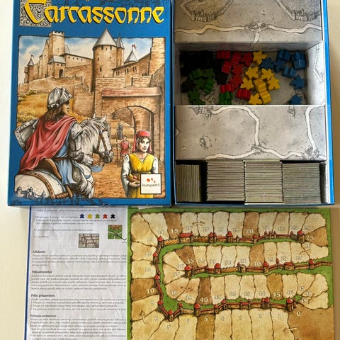 Siisti vanhempi versio Carcassonne klassikosta. Laatikossa kulumaa..