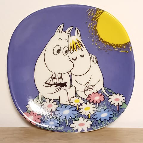 Sunnuntaikävely-seinälautanen julkaistiin vuonna 1999 ja se poistui tuotannosta vuonna 2005. Seinälautasen halkaisija on 12 cm. Tove Slotte on muokannut kuvitukset Muumi-tuotteisiin Tove Janssonin alkuperäisten kuvitusten ja piirrosten pohjalta. Valmistanut Arabia