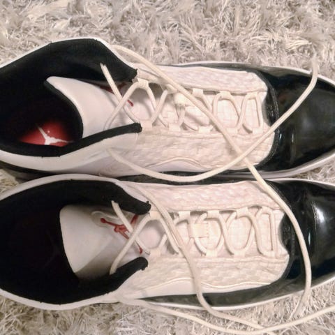 Jordan Tennarit kengät koossa 42.5 Kengissä on valkoinen ja vaaleanpunainen väritys, ja ne on valmistettu kestävästä materiaalista. Sisävuori on kuvioitu, ja kengissä on punaiset yksityiskohdat sekä vaihdettavat vaaleanpunaiset nauhat.