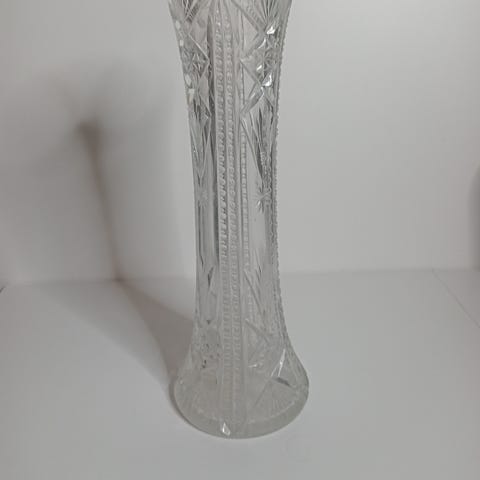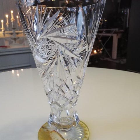 Pieni kristallimaljakko. Kunto moitteeton. Korkeus n. 15 cm, halkaisija ylhäällä n. 8,5 cm, alhaalla n. 5 cm.
