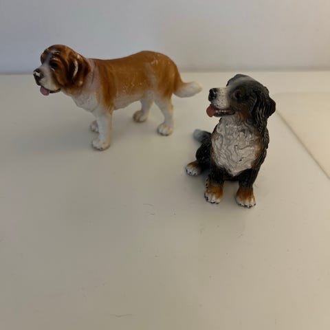 Schleich koirafiguurit; sisältää kolme erilaista koiraa (kultainen noutaja, berhandinkoira ja bernin paimenkoira) ja pienen ruokakipon.