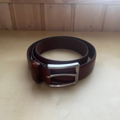 Dressmann-vyö Erittäin hyvässä kunnossa Ei vikoja Vyö on valmistettu pehmeästä aidosta nahasta. Ruskea, antiikkikultainen solki. Koko 40-42 Todelliset mitat Kokonaispituus ilman solkea Noin 120 cm Etäisyys ensimmäiseen reikään ilman solkea Noin 100 cm viimeiseen reikään Noin 112 cm Hihnan leveys: Noin 3,5 cm Soljen mitat: