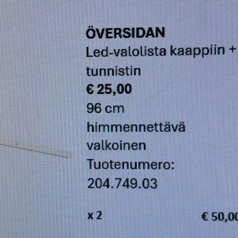 Näppärä valaisin, kolme toimintoa eli on/off/auto - saa toimimaan siten että syttyy, kun avaat vaatekaapin oven. 42cm leveä eli mahtuu 50cm leveän PAX-rungon sisään. Katso toinen ilmoitukseni jossa muuntaja, joka toimii esim. tämän valon kanssa.
