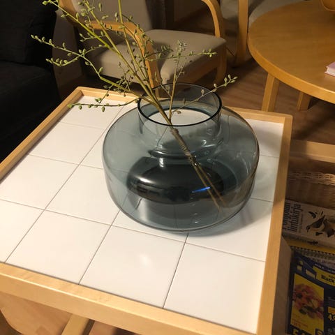 Marimekko Home lasimaljakko, pyöreä muoto, harmaa väri. Sopii sisustukseen ja kukkien esillepanoon.