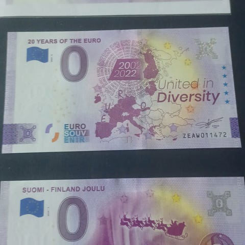 Suomen Moneta nolla euron keräilysetelit. Setelit on tarkoitettu keräilykäyttöön eikä sillä ole rahallista arvoa.