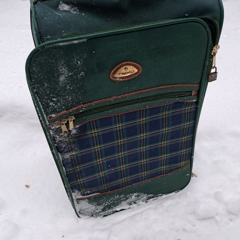 Käytetty säilytykseen sisätiloissa. Toimiva matkalaukku, ikä näkyy pinnassa paikoittain, verhoilu sisäpinnalla muuten ehjä mutta kaipaa uudelleen liimausta paikoittain. 99x43x23cm. Nouto Kumpulasta.