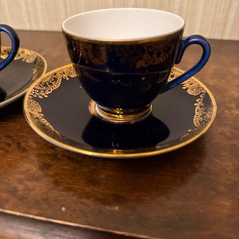 Tämä on Lomonosovin koboltinsininen ja kultainen kahvikuppi ja lautanen.