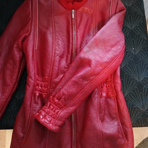 Hyväkuntoinen nahkatakki. Ohut vuori. Väljä malli. Vetoketjutaskut edessä. Hihansuissa vetoketjut. Takki on siannahkaa, vuorikangas polyesteriä.