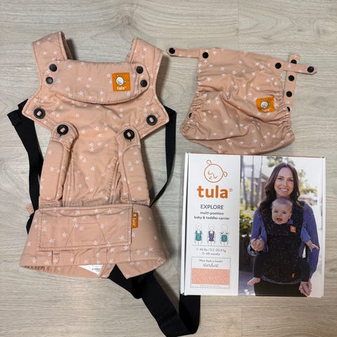 Hyvä kantoreppu vastasyntyneestä pikkulapselle asti (3,2kg - 20,4kg). Tässä tukevassa repussa lasta saa kannettua useammassa eri asennossa. Tummassa kankaassa paikoin pientä haalistumaa, mutta yleisilme todella siisti. Pesty viimeisen käytön jälkeen tuoksuttomasti. Mukana tulee huppu, ohjevihko ja alkuperäinen laatikko.