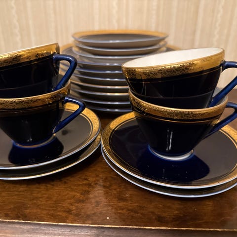 Väri: Syvä koboltinsininen, valkoinen ja 22 karaatin kulta.