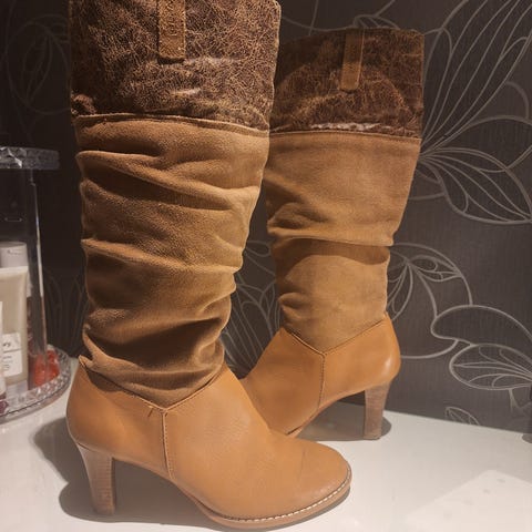 Vaalean ruskeat saappaat. Kokolapussa lukee 39 mutta minusta ehkä vastaa enemmän kokoa 38. Sivussa vetoketju. Eläintalous.