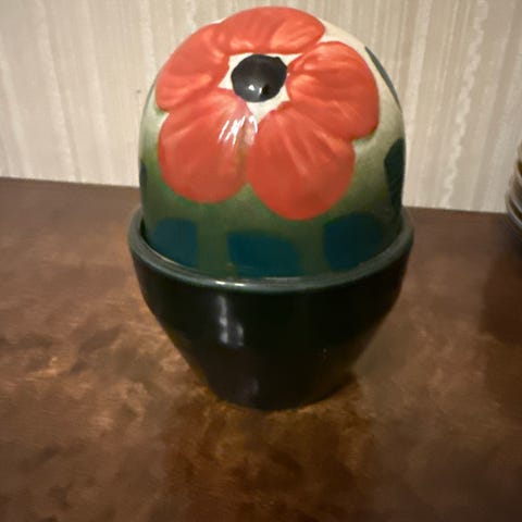 Tämä on Arabian Ikikukka-sarjan keraaminen purkki, jonka on suunnitellut Heljä Liukko-Sundström.