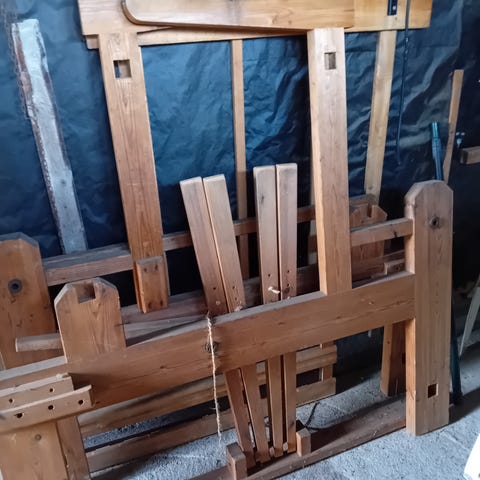 Toijalan kaidetehtaan kangaspuut. Loput osat löytyvät varastosta. Säilytetty lämminvarastossa. Purettu osiin, joten helposti lastattavissa kyytiin. Haku. <3