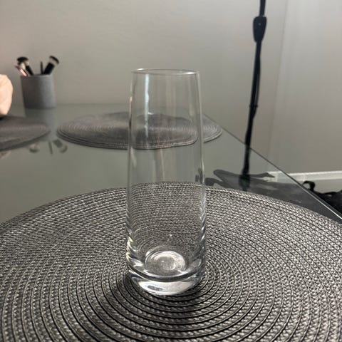 Lasinen koriste-esine, maljakko. Kirkas lasimateriaali, koristeellinen muotoilu. Sopii kukkien asetteluun tai sisustuselementiksi.