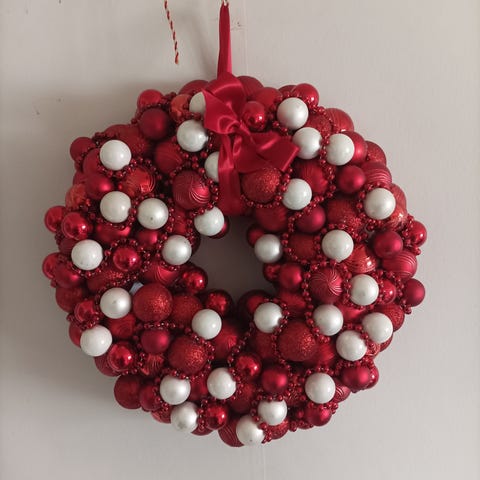 Virkattu kranssi ruseteilla. Leveys n. 26cm