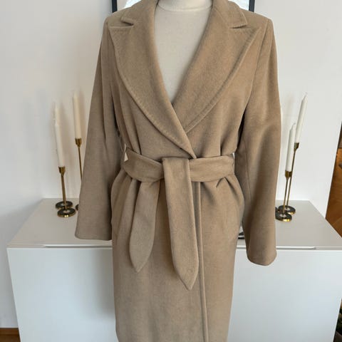 Max Mara Pitkä villakangastakki naisten koko 42. Takki on beige ja 100 % villaa. Malli on pitkä ja siinä on kaksi etutaskua sekä yksinkertainen napitus.
