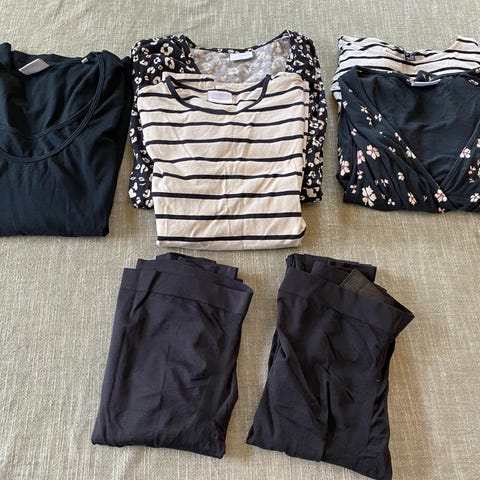 Pääasiassa hyväkuntoisia äitiysvaatteita koolla s ja farkkuhame koko 38. Imetyspaita vähän käytetympi ja toisessa kauluspaidassa joku tahra. Mamaliciois lappuhaalarit erinomaisessa kunnossa.