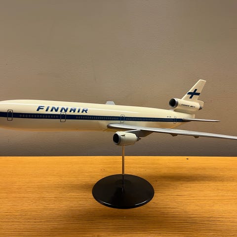 Finnair McDonnell Douglas MD-11 lentokonemalli. Valkoinen runko sinisillä Finnair-teksteillä ja logoilla. Malli esittää kolmoismoottorista lentokonetta, joka on kiinnitetty jalustaan. Voit myös tehdä järkevän tarjouksen.