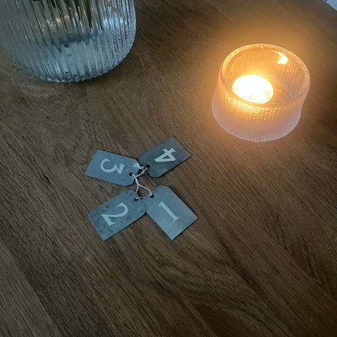 Rustiikkityylinen juhlava pöytäkoriste . 4 lasista tuikkupidikettä. Pituus 35 cm.