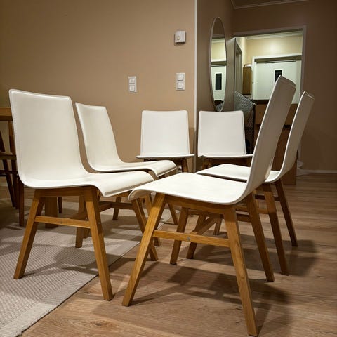 6 valkoista nahkatuolia tammijaloilla. Kaksi tuoleista habitat merkkiä ja 4 tuolia, joiden merkki ei ole tiedossa.