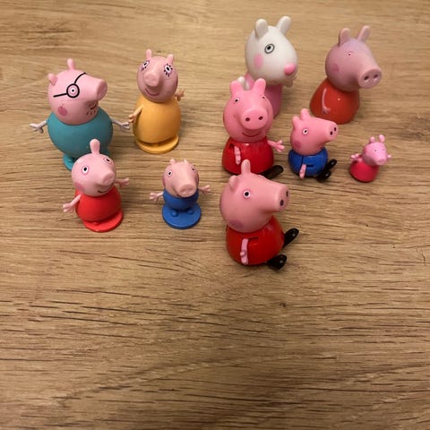 Myydään Pipsa Possu lastenlelusetti, joka sisältää hahmoja ja kouluteemaisia esineitä, kuten pulpetit ja liitutaulun. Madam Gaselli, Pipsa possu, Lotta Lammas, Kerkko Koira ja Kati Kissa koulussa.
