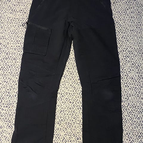 Hyväkuntoiset retkeilyhousut, paitsi lahkeissa vähän jotain tummentumaa.