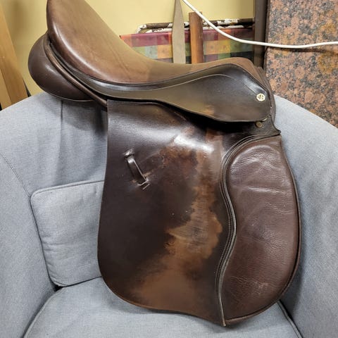 Cliff Barnsby ponisatula ehkä 15"? sopinee suorahkoon ja aika leveään selkään, meidän kaarevaselkäiselle pikkuponille liian suora. Istuimen nahka kulunut, mukana tarkempi kuva, ei haittaa käyttöä ja on mukava satula pikkukuskin istua. Vastinhihnat hyvässä kunnossa.
