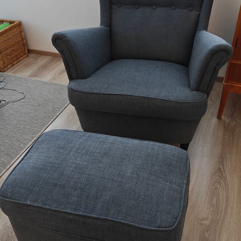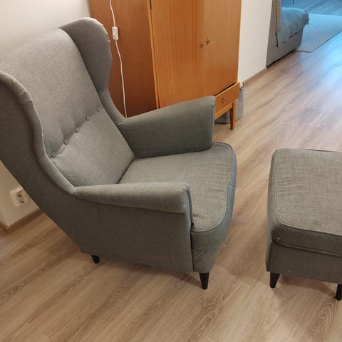 Myydään erittäin mukava ja tyylikäs IKEA Strandmon -nojatuoli rahilla, väri tummanruskea.