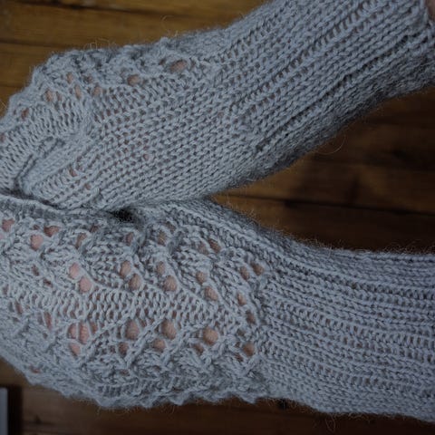 Tummahkot luonnonvalkoiset käsineet melkein kuin lapaset, lämmittää käsiä, mutta jättää sormenpäät vapaaksi. Käytä sormikkaiden kanssa tai ilman. Ranteessa resori, ranteessa ja kammenselässa pitsinen osuus, sormien kohdalla lyhyt resori. Kämmenen sisäpuoli sileää neulosta.