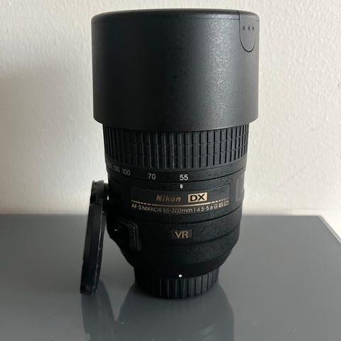 Nikonin 55-300mm DX koon vakaimella varustettu objektiivi, jossa on 55 mm suodinkierre ja mukana tulevat vastavalosuoja (HB-57) sekä kotelo (CL-1020).