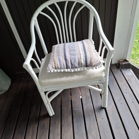 Hyvä kuntoinen kuvan tuoli johon kuuluu beessin värinen pehmuste. Pinta käsittely uusittu.