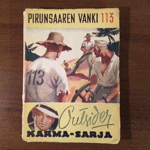 Outsider ja Hirmuinen on kirja, joka sisältää tarinan tai tapahtumia, kuten Monte Carlos -tapahtuman. Kirjan kansi ja sivut ovat näkyvissä kuvissa, ja kirjan hinta on 90 markkaa. Kirja on painettu suomen kielellä.