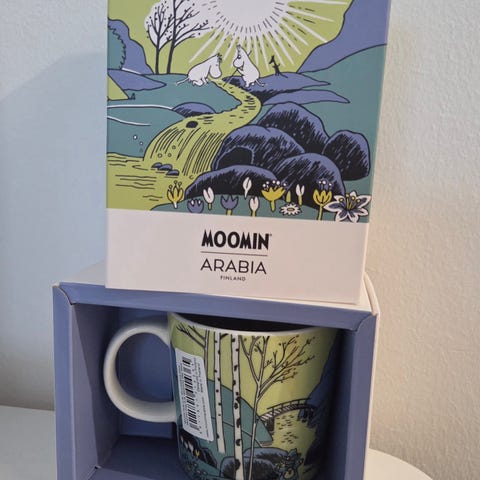 Arabia Muuminpäivä 2024 muumimuki, uusi, pahvipaketissaan ja tarra.