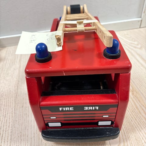 Puinen paloauto ja ukko. Käytön jälkeä paljon. Ei ehkä lahjaksi, mutta leikkeihin passaa.
