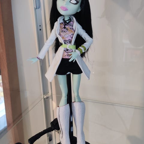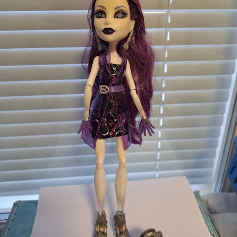 Monster High nukke, mukana asusteita kuten laukku. Nukella on violetti ja musta asu, vaaleanpunaiset hiukset ja vaalea iho. Soveltuu lasten leikkeihin.
