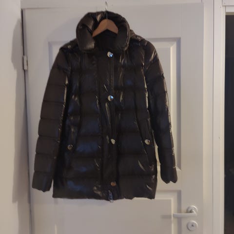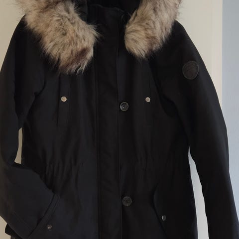 Valkoinen toppatakki, kokomerkintä L, mutta on pientä kokoa, vastaa kokoa M. Tekokarvakaulus kiinteä hupussa, huppu irrotettavissa.
