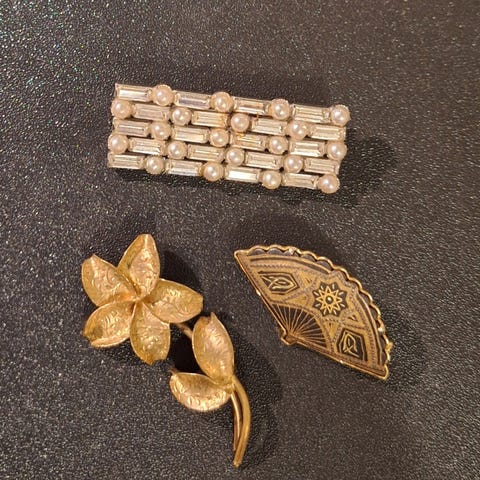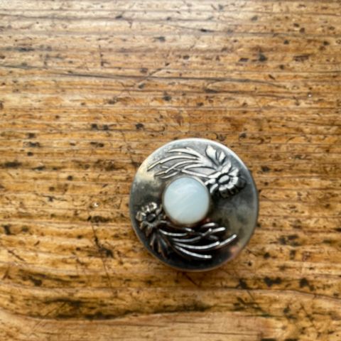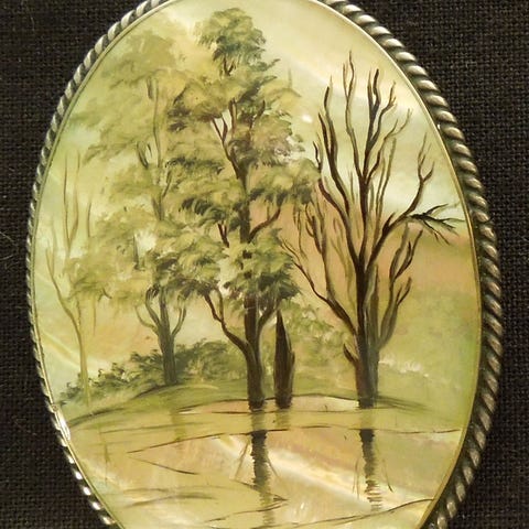 Kaunis posliinille maalattu rintakoru 3 x 4 cm. Takana taiteilijan signeeraus, A-L Määttälä -91. 10 e.