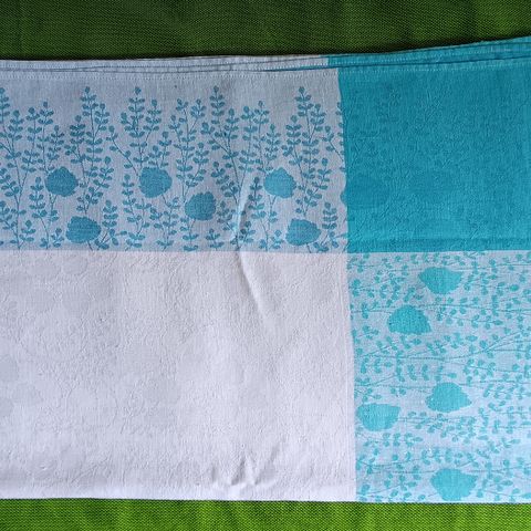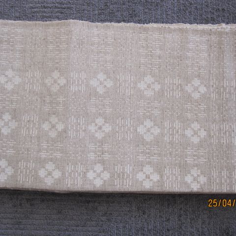 Porokuvioinen pellavakaitaliina, koko 142 x 48 cm.