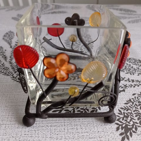 Metallinen kynttilälyhty lasiseinil ja kolme pientä tekokanervaa kauniilla alustalla. Lyhdyn leveys 31cm, korkeus 22cm.